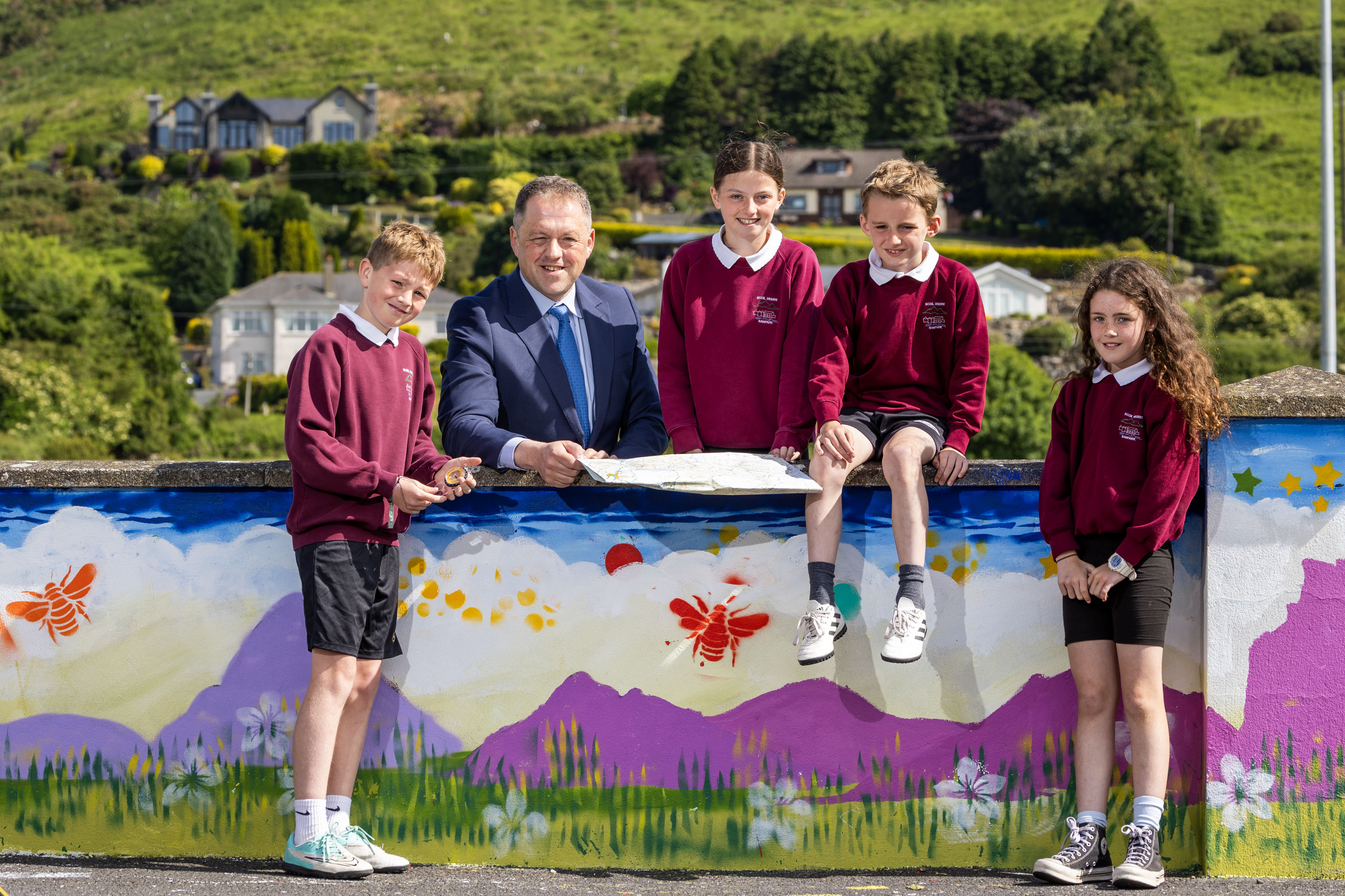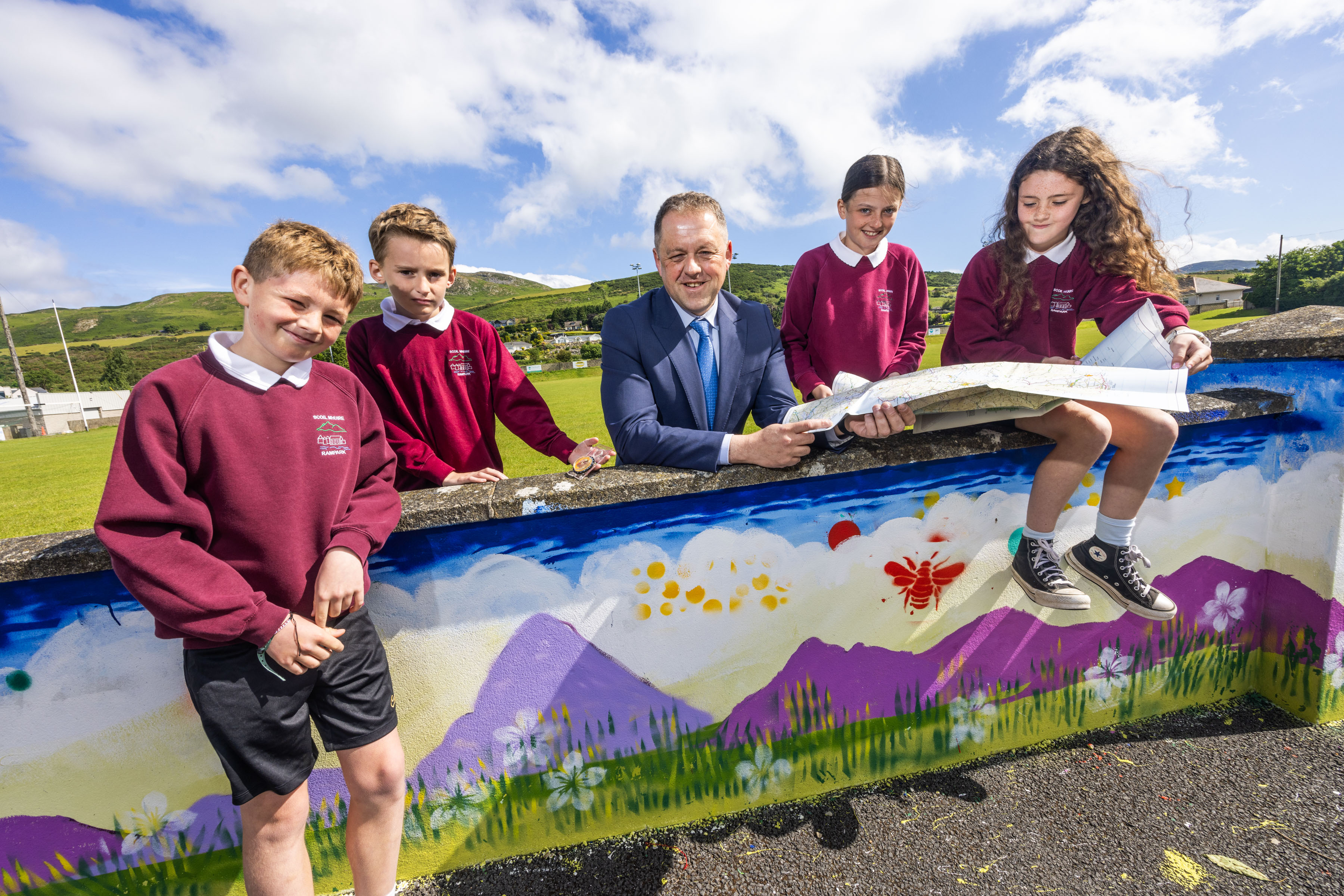 Pic 2: Minister of State for Sport, Physical Education and the Gaeltacht, Thomas Byrne TD, pictured with Niall Rogan, Tom Nolan, Sarah Devane and Clodagh McCann, pupils of SN Muire Rampark, Jenkinstown, Dundalk, Co. Louth. Minister Byrne was at the school today (Monday) to announce the 24 schools nationwide selected to take part in a new pilot programme focused on promoting physical activity in teaching and learning. Photo: Fintan Clarke Photography